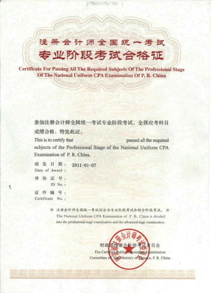 连续5个年度考试中取得专业阶段考试全部科目合格成绩的考生,颁发注册会计师全国统一考试专业阶段考试合格证。取得该专业阶段考试合格证后可报考综合阶段考试。对取得综合阶段考试科目合格成绩的考生,颁发注册会计师全国统一考试全科合格证。