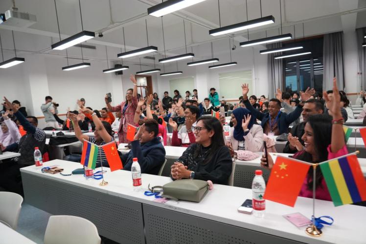 活动中,“击鼓传花”破冰环节率先点燃气氛,话筒传递间,手持者用英语自我介绍,快速拉近彼此距离。核心环节“沉浸式文化探索工作坊”中,多个特色文化站点开放,各小组依次体验,沉浸式感受两国文化魅力。汉字书法站点里,崔明润、刘健琨、隋金昊三名同学耐心讲解汉字笔画美学与“福”、“友”等字的美好寓意,为毛里求斯嘉宾定制中文名字并指导书写;中国茶艺体验站点内,吴俊毅同学细致演示绿茶、乌龙茶冲泡技艺,分享茶道精神,毛里求斯嘉宾驻足观色、闻香、品茗,还热情交流当地红茶文化;毛里求斯文化专区更是热闹非凡,嘉宾分享地理历史民俗知识,带领大家跳起传统Sega舞,将现场气氛推向高潮。此外,彭子函、陈力扬同学的民族舞蹈与笛子独奏,尽显中华传统文化韵味,获嘉宾一致好评。