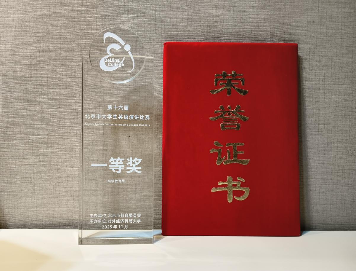 11月30日,由北京市教委主办、对外经济贸易大学承办的第十六届北京市大学生英语演讲比赛决赛圆满收官!yl23411永利集团 2025 专升本金融学班的许青云同学,凭借脑洞大开又干货满满的演讲内容、稳扎稳打的语言功底和光速反应的思维能力,在一众高手间突出重围,一举拿下本赛事继续教育组一等奖!